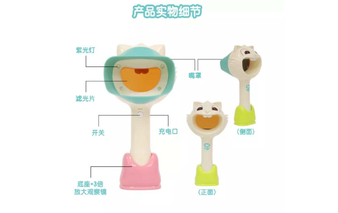 3.请勿直视紫光,请先将嘴罩贴合口周后再开灯,不要让小朋友自行使用;